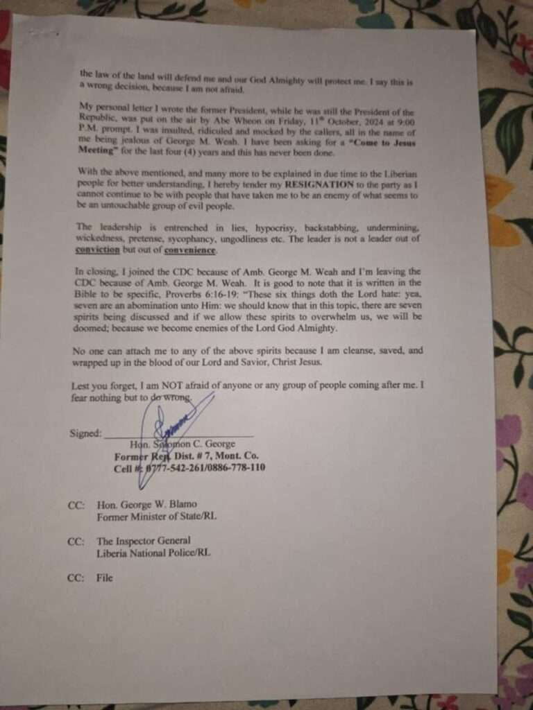 Monrovia, Liberia — A former Representative of Montserrado County District #7, and a staunch member of the Congress for Democratic Change (CDC), Solomon C. George has publicly announced his resignation from the party after five years of growing dissatisfaction with its leadership, particularly with the party’s Standard Bearer, Amb. George M. Weah.