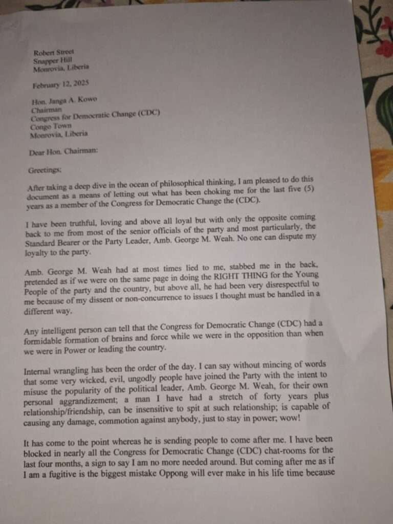 “Amb. George M. Weah had, at most times, lied to me, stabbed me in the back, and pretended as if we were on the same page in doing the right thing for the young people of the party and the country,” the letter highlighted.