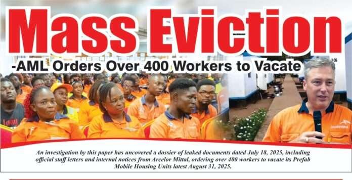 An investigation by this paper has uncovered a dossier of leaked documents dated July 18, 2025, including official staff letters and internal memos from ArcelorMittal Liberia (AML), ordering over 400 employees to vacate its Prefab Mobile Housing Units no later than August 31, 2025.