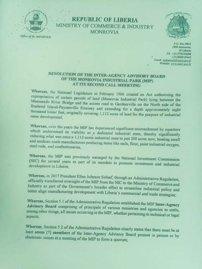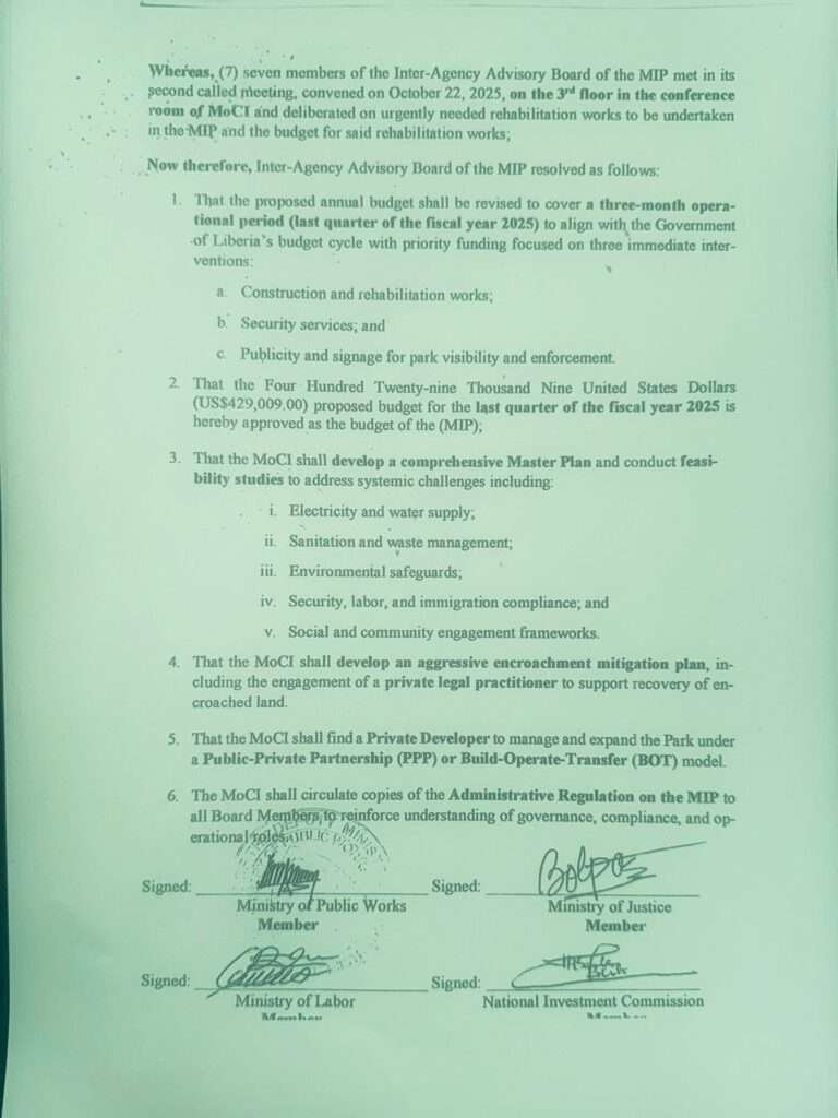 Several government ministries and agencies have reportedly signed a resolution approving a US$429,009 budget for rehabilitation works at the Monrovia Industrial Park (MIP), a move that critics say violates the Public Procurement and Concessions Commission (PPCC) and Public Financial Management (PFM) laws.