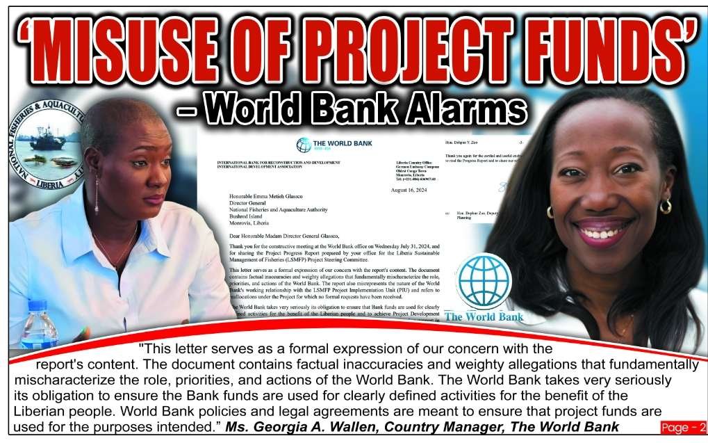 In a letter dated August 16, 2024, addressed to the Director General of the National Fisheries and Aquaculture Authority (NaFAA), Hon. Emma Metieh Glassco, the Liberia Office of the World Bank has expressed concerns about the usage of funds allocated for the Liberia Sustainable Management of Fisheries Project (LSMFP).