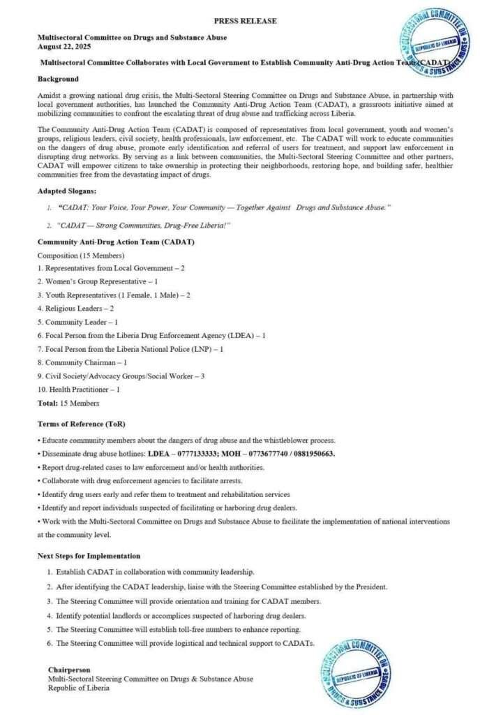 Monrovia, Liberia — In a decisive move to address the growing national drug crisis, the Multi-Sectoral Steering Committee on Drugs and Substance Abuse has formed a partnership with local governments to establish the Community Anti-Drug Action Team (CADAT). This grassroots initiative is designed to actively involve communities in the fight against drug abuse and trafficking across Liberia.