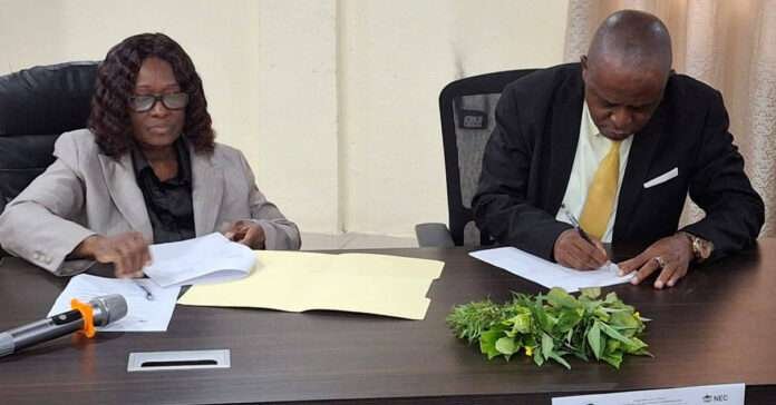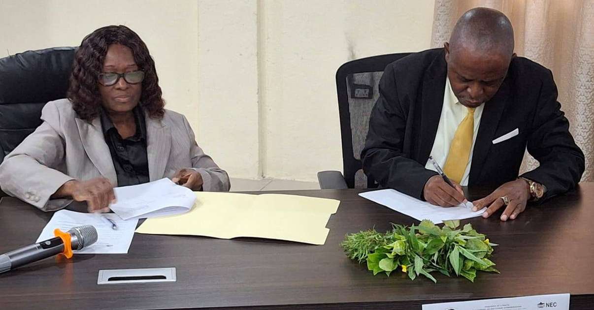 NEC Chairperson Madam Davidetta Browne Lansanah signed on behalf of the Commission, while NIR Executive Director Andrew Peters represented his agency. All seven members of the NEC Board of Commissioners (BOC) were present for the event.