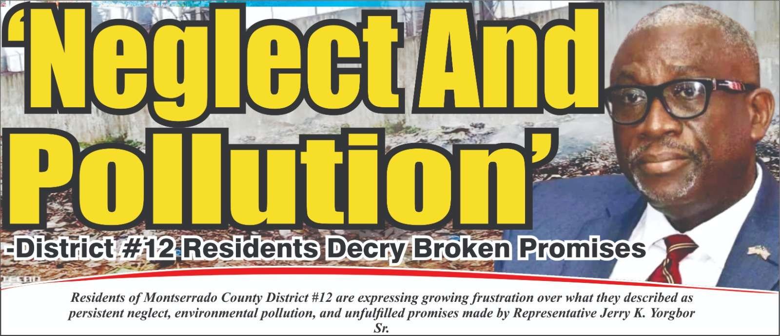 Residents of Montserrado County’s District 12 are expressing growing frustration over what they described as persistent neglect, environmental pollution, and unfulfilled development commitments by their elected Representative, Hon. Jerry K. Yorgbor Sr.