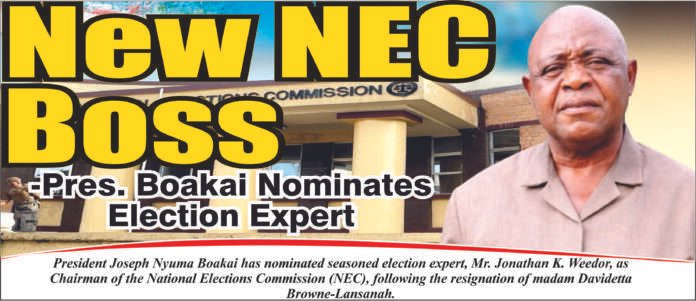 President Joseph Nyuma Boakai has nominated seasoned election expert, Mr. Jonathan K. Weedor, as Chairman of the National Elections Commission (NEC), following the resignation of Madam Davidetta Browne-Lansanah.