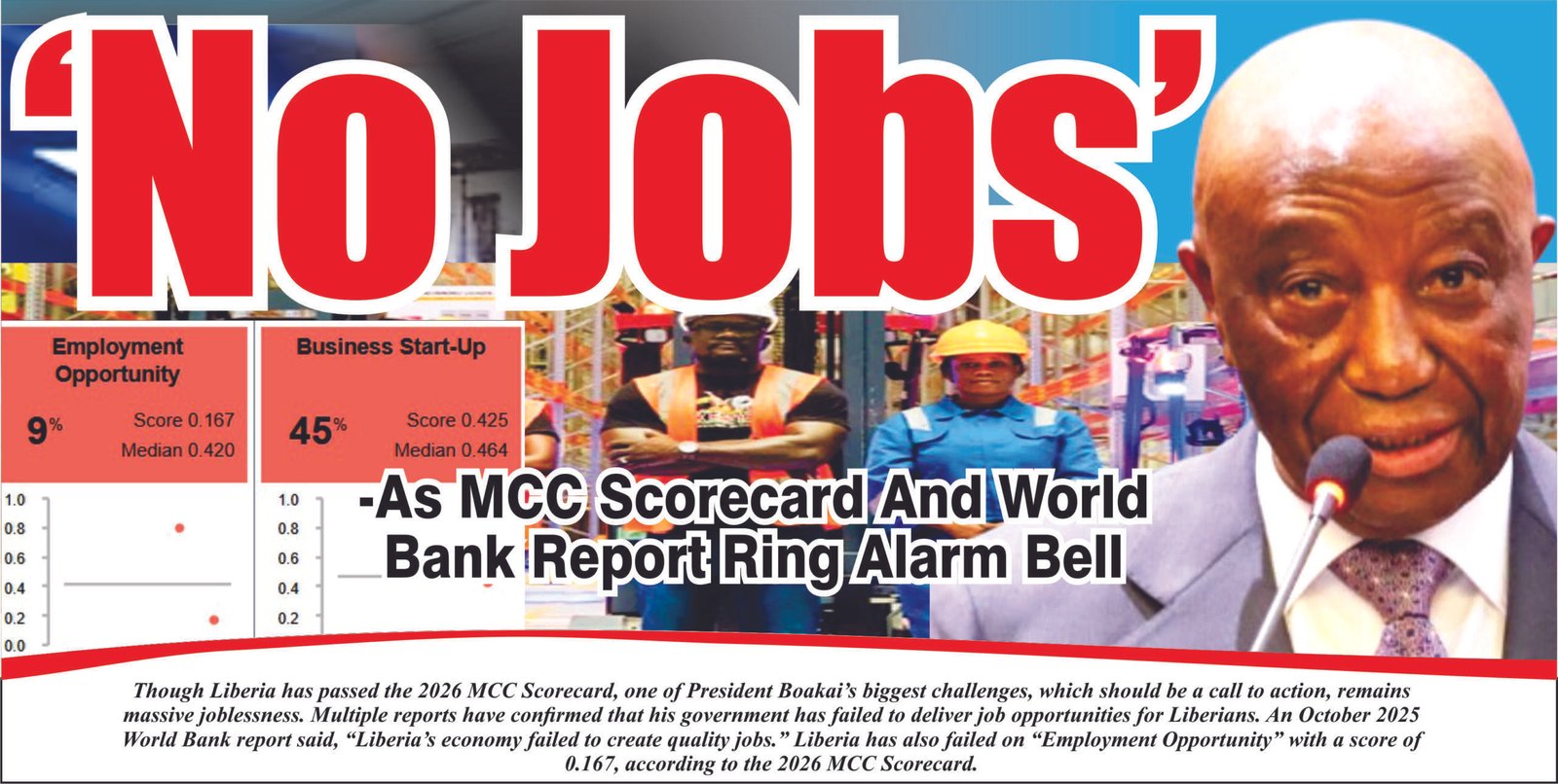 An October 2025 World Bank report said, “Liberia’s economy failed to create quality jobs.” Liberia has also failed on “Employment Opportunity” with a score of 0.167, according to the 2026 MCC Scorecard.