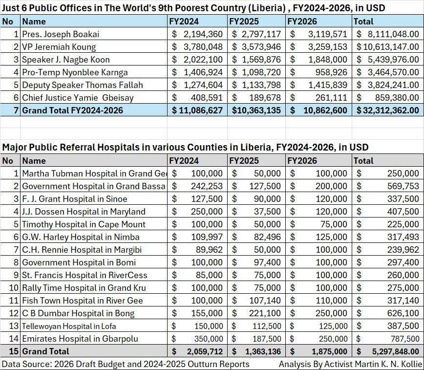 Fourteen (14) major referral hospitals in various counties with a population of 3.33 million people got a total of just US$5.2 million from 2024 to 2026 while offices of just 6 ‘big shots’ got a whopping US$32.3 million. All fourteen (14) major referral hospitals got just 16.3% of what only 6 senior public officials (big shots) got. Who are they really serving? The People or Themselves? “Rescue” or “Re-use”?