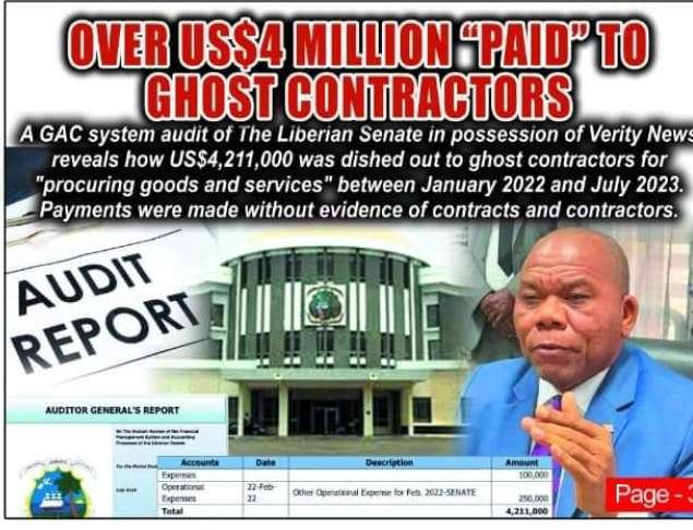Monrovia-Liberia: A GAC system audit of The Liberian Senate in possession of Verity News reveals how US$4,211,000 was dished out to ghost contractors for “procuring goods and services” between January 2022 and July 2023. Payments under former Senate Pro Tempore Albert Tugbe Chie were made without evidence of contracts and contractors according to a July 2024 GAC System Audit Report.