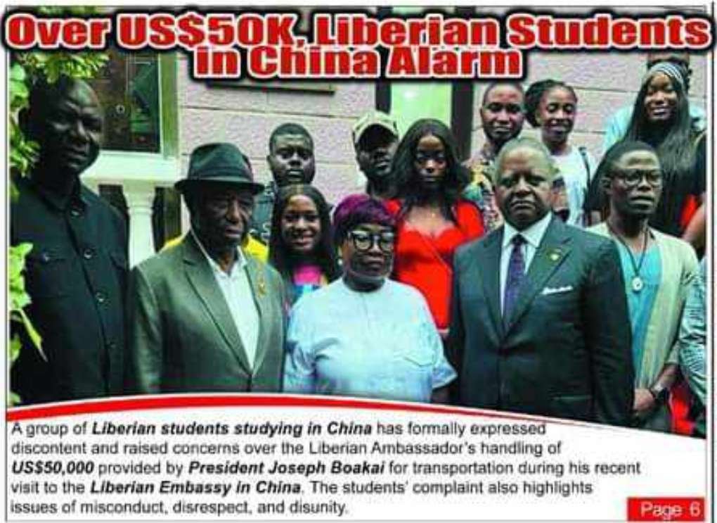 A group of Liberian students studying in China has formally expressed discontent and raised concerns over the Liberian Ambassador’s handling of US$5,000 provided by President Joseph Boakai for transportation during his recent visit to the Liberian Embassy in China.