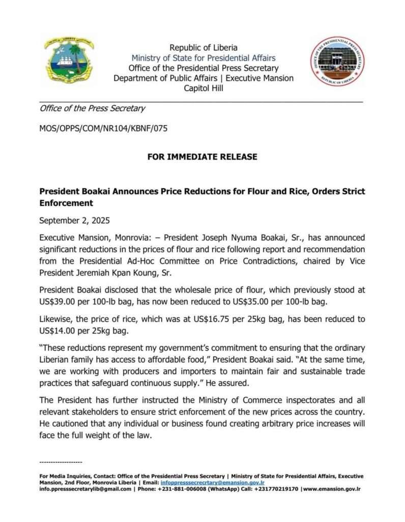 Monrovia, September 2, 2025 – In a move aimed at easing the financial burden on Liberian households, President Joseph Nyuma Boakai, Sr., has announced sweeping reductions in the prices of rice and flour, two of Liberia’s most important staples.