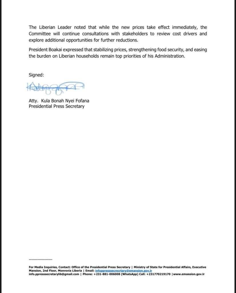 While the new prices take immediate effect, President Boakai assured that the committee will continue engaging stakeholders to review cost drivers and identify more opportunities for reductions in essential commodities.