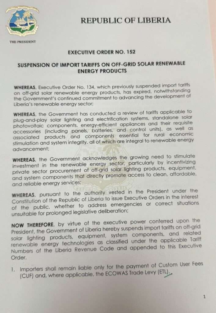 Executive Mansion, Monrovia – President Joseph Nyuma Boakai, Sr., has issued Executive Order No. 152, suspending import tariffs on off-grid solar renewable energy products in a decisive move to boost Liberia’s transition to clean and affordable energy.