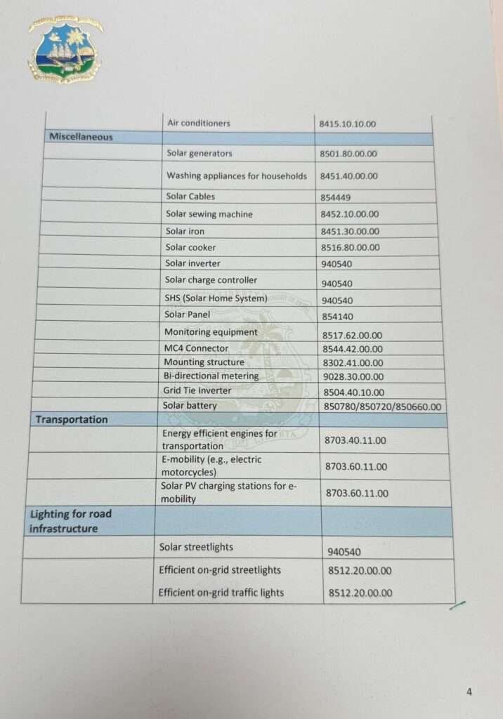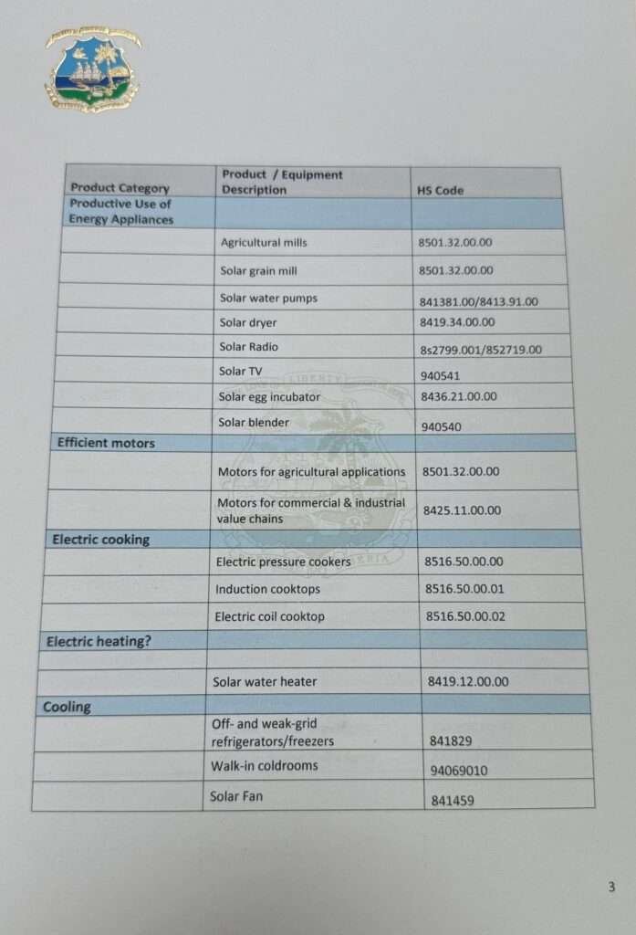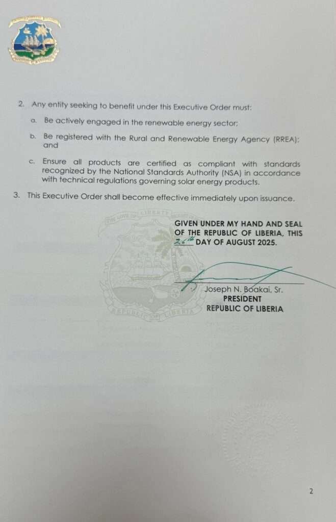 President Boakai emphasized that this measure is aimed at stimulating private sector investment, reducing costs for consumers, and expanding access to reliable electricity for households, businesses, and institutions across Liberia. “Clean and affordable energy is central to our development agenda. By removing barriers to importation, we are creating opportunities for Liberians to access renewable energy solutions that improve livelihoods, power businesses, and strengthen our economy,” the President noted.