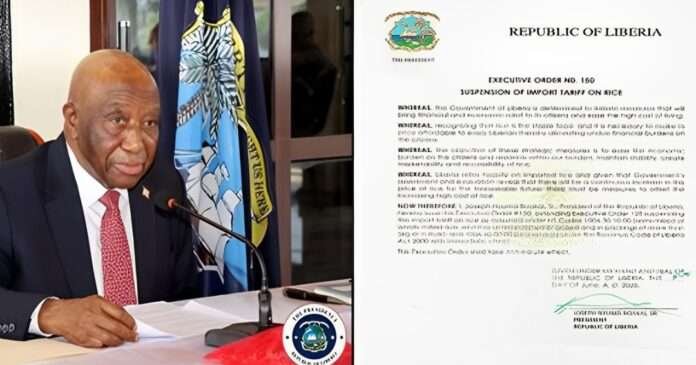 In a move aimed at reducing the cost of living and ensuring food affordability, President Joseph Nyuma Boakai, Sr. has signed Executive Order No. 150, officially suspending import tariffs on key categories of rice.