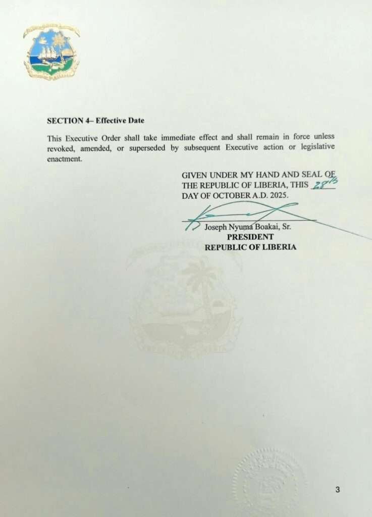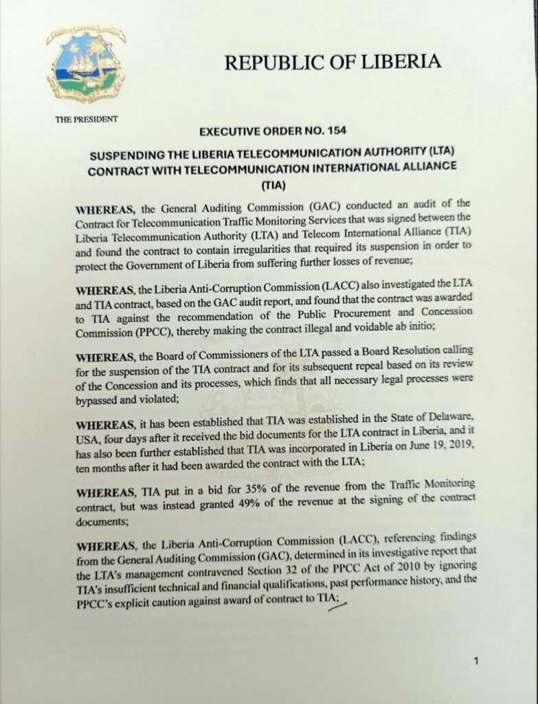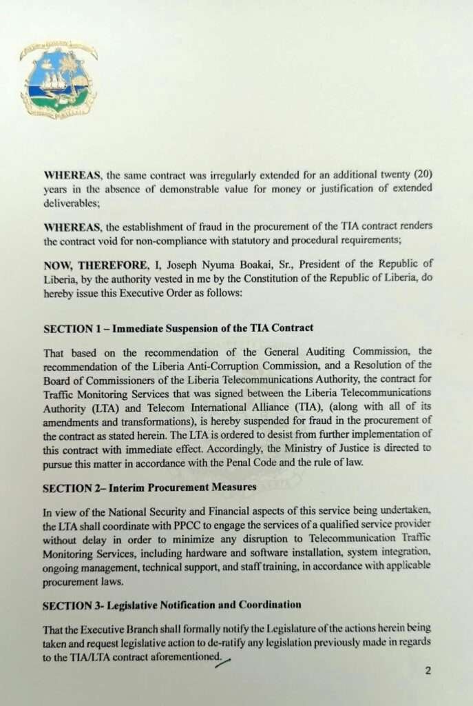 In Executive Order No. 154, issued on Friday , October 31, 2025, President Boakai ordered the immediate halt of all activities under the contract for Telecommunication Traffic Monitoring Services. The President’s decision comes after investigations revealed that the agreement was marred by violations of the Public Procurement and Concessions Commission (PPCC) Act and was awarded under questionable circumstances.