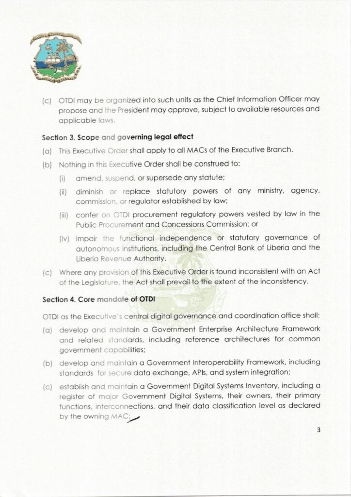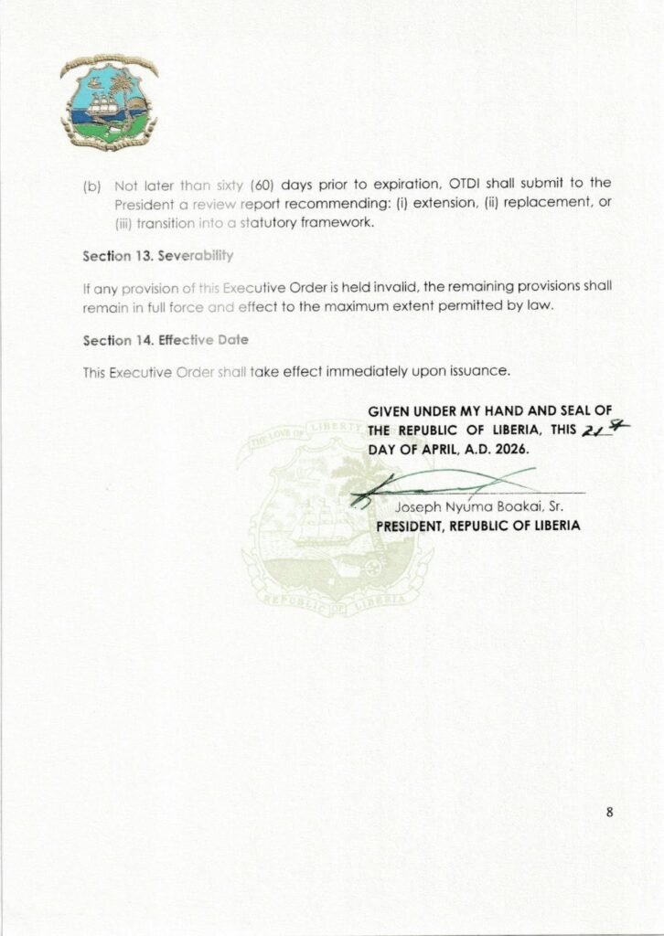 Importantly, the Executive Order clarifies that it does not amend, suspend, or override any existing Act of the Legislature and preserves the statutory independence of key institutions, including the Central Bank of Liberia and the Liberia Revenue Authority.