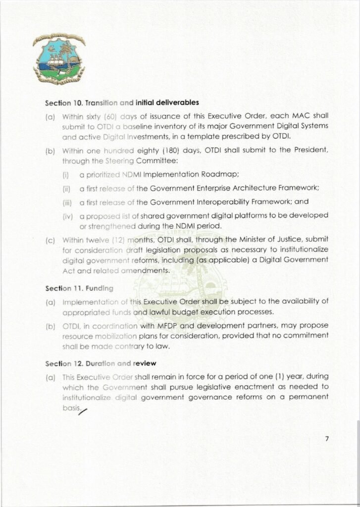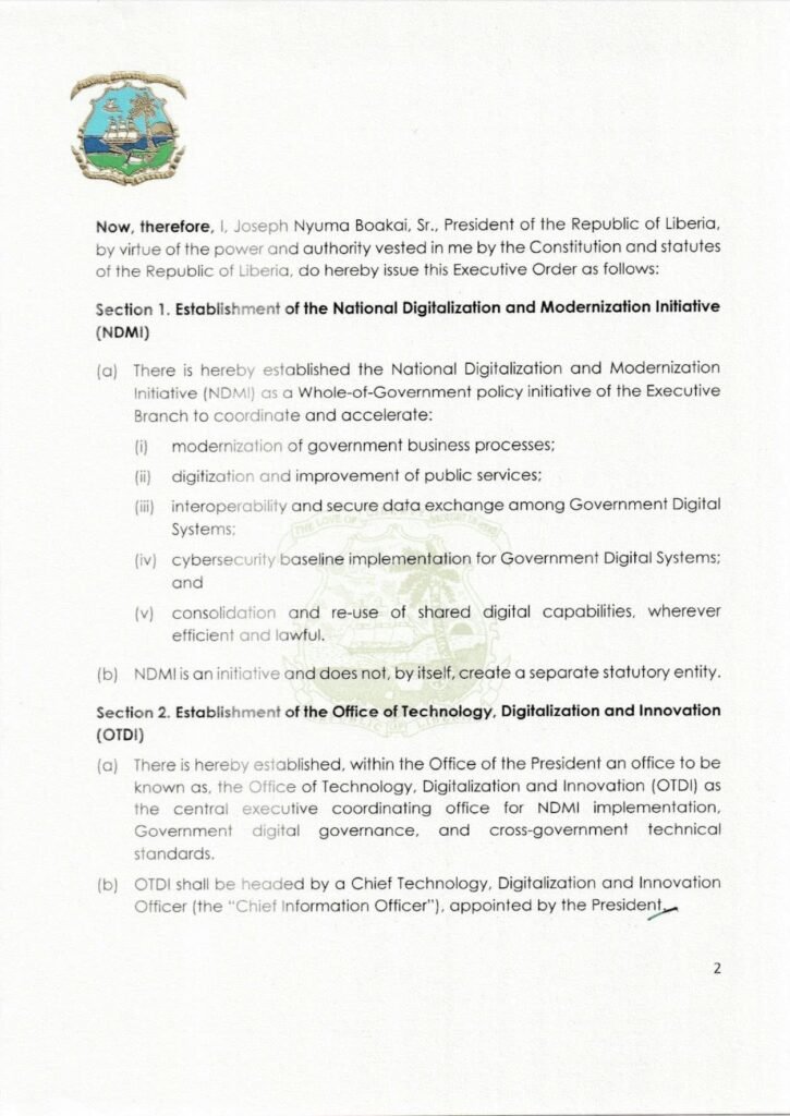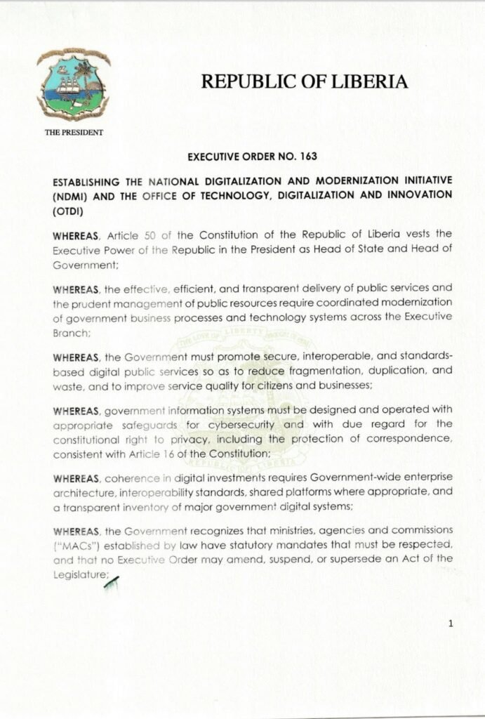 President Joseph Nyuma Boakai, Sr. has issued Executive Order No. 163, launching the National Digitalization and Modernization Initiative (NDMI) and establishing a new Office of Technology, Digitalization and Innovation (OTDI) as part of a sweeping reform aimed at modernizing Liberia’s public sector and advancing the country’s digital future.