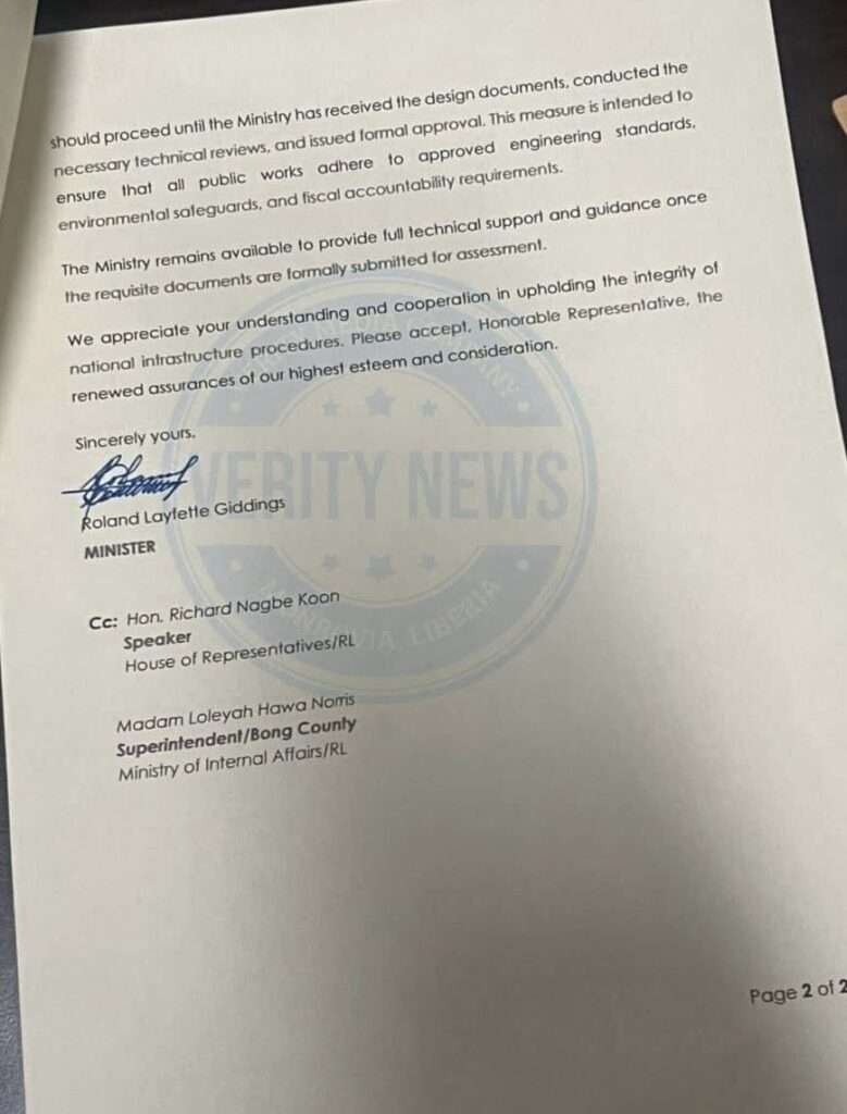 “The Ministry acknowledges reports of a groundbreaking ceremony recently held for the construction of a bridge in Bong County, which was undertaken without prior notice to the Ministry and without the submission of the bridge design for technical review and approval,” the letter read.