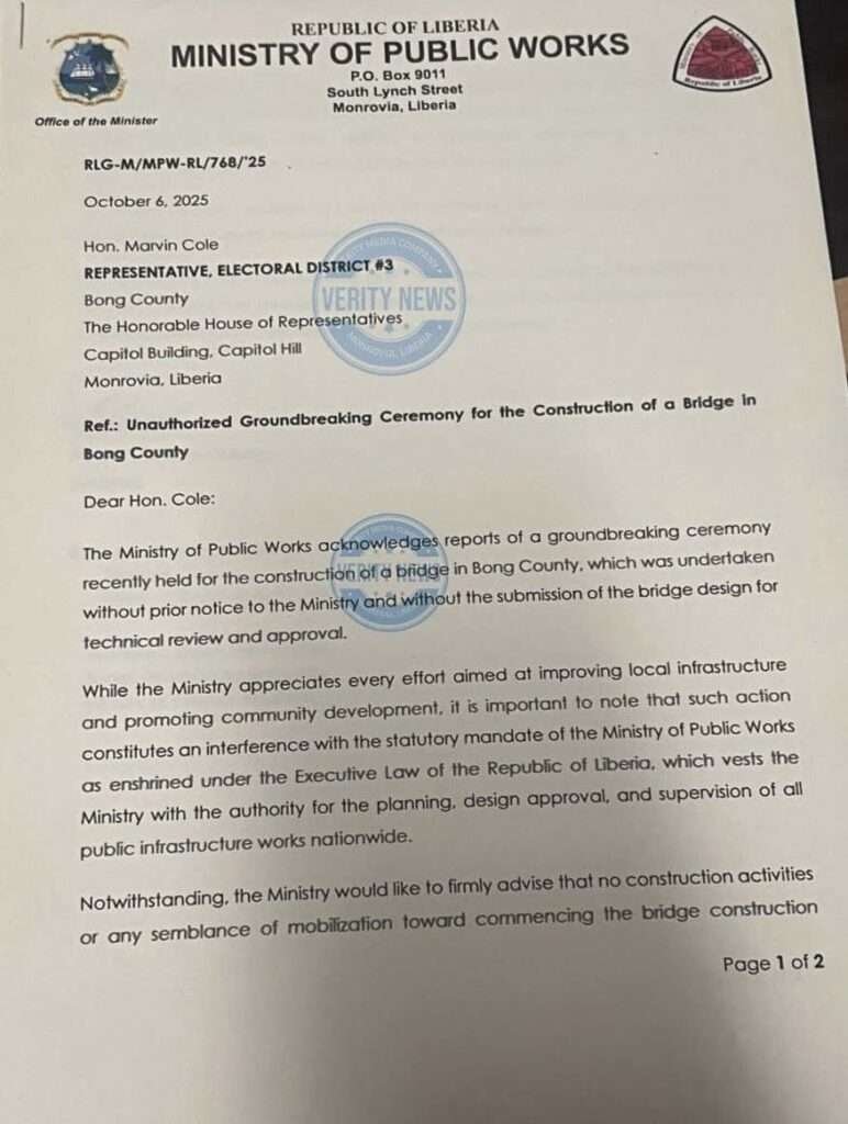 Monrovia, Liberia — The Ministry of Public Works has issued a formal warning to Bong County District #3 Representative, Hon. Marvin Cole, over a recent unauthorized groundbreaking ceremony for the construction of a bridge in the county.