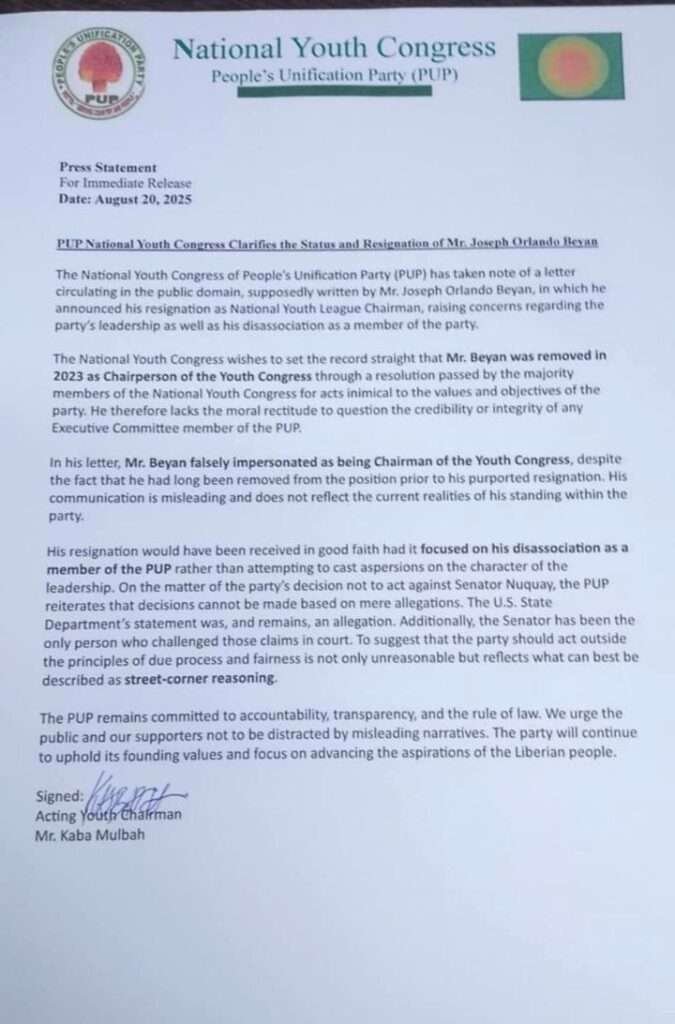The National Youth Congress of the People’s Unification Party (PUP) has officially rejected claims made by its former Youth League Chairman, Joseph Orlando Beyan, asserting that he was expelled from the party as far back as 2023 and no longer holds any leadership position.