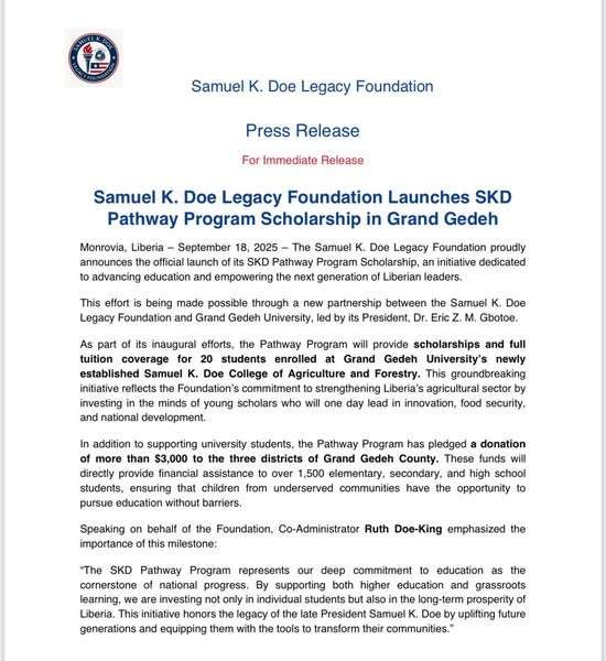 The Samuel K. Doe Legacy Foundation, run by children of former Liberian President Samuel K. Doe, has launched its SKD Pathway Program Scholarship, a new initiative aimed at expanding educational opportunities and empowering young Liberians.