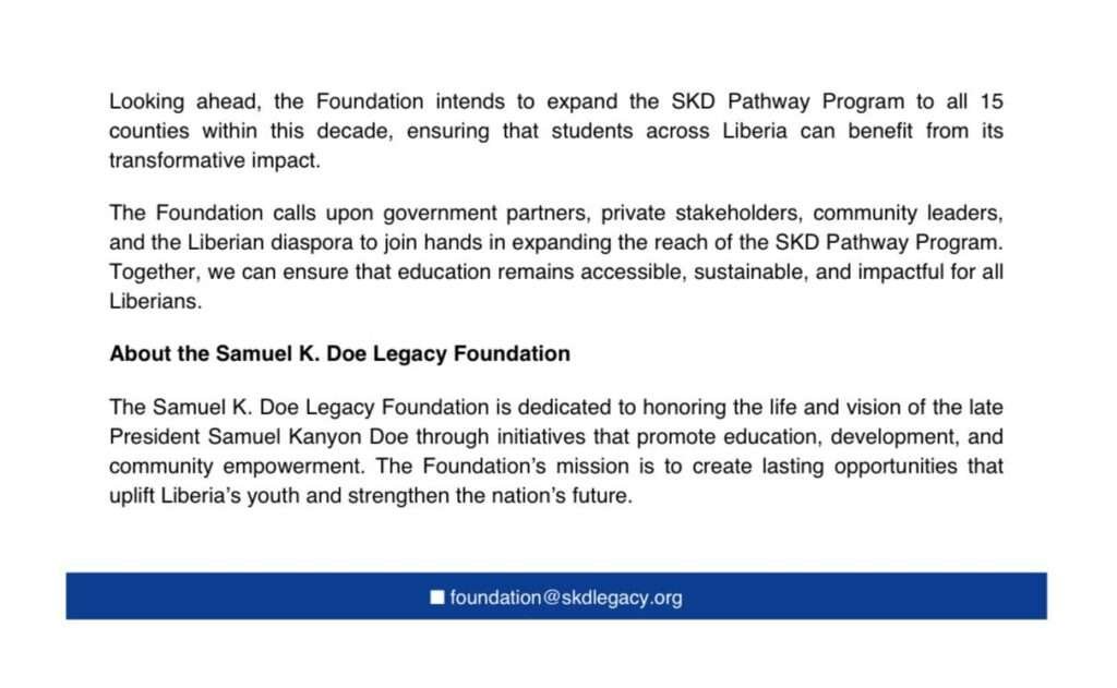 Looking ahead, the Samuel K. Doe Legacy Foundation plans to extend the scholarship program to all 15 counties within the decade.