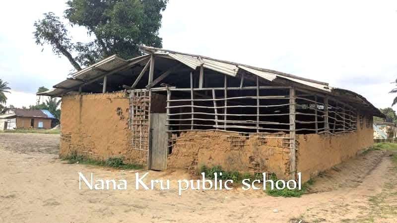 Nana Kru Public School — leaking roofs, missing desks, and dangerous conditions during the rainy season.