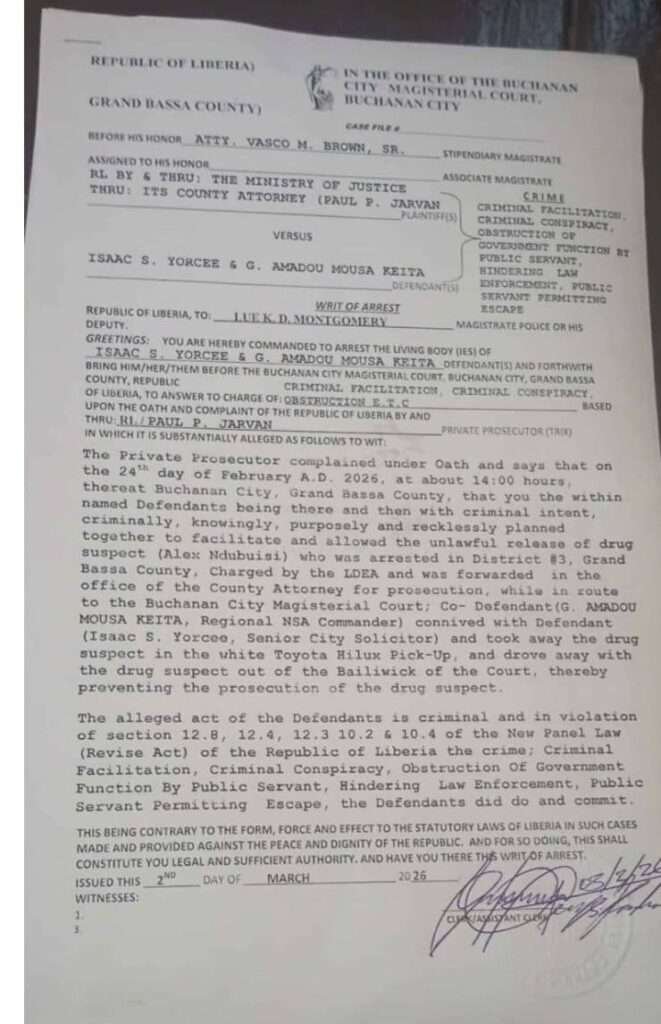 BUCHANAN (March 4,2026)~ A major legal storm is unfolding in Liberia as the Senior City Solicitor of the Buchanan Magisterial Court, Isaac Yorcee, and the Regional Commander of the National Security Agency (NSA), Amadou Mousa Keita, face serious criminal charges over the alleged unlawful release of a drug suspect.