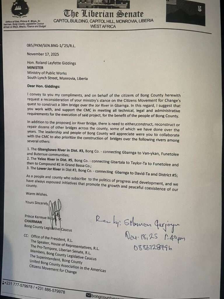 Monrovia, Liberia — Bong County Senator Prince K. Moye, Sr., has called on Public Works Minister Roland Layfette Giddings to reconsider the ministry’s position on a proposal by the Citizens Movement for Change (CMC) to construct a 38-meter bridge over the Jor River in Gbarnga.