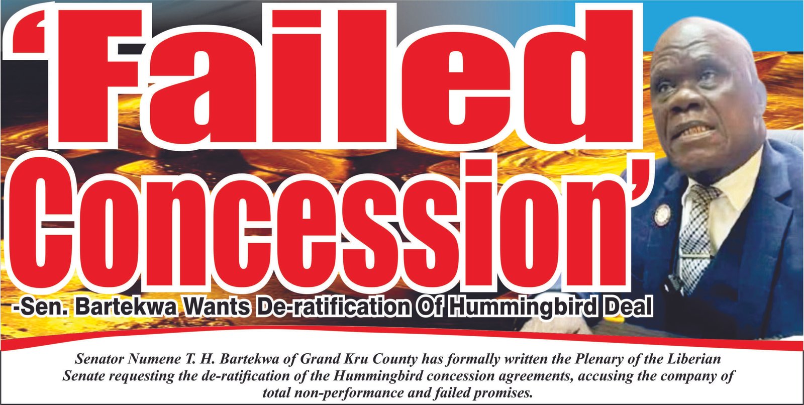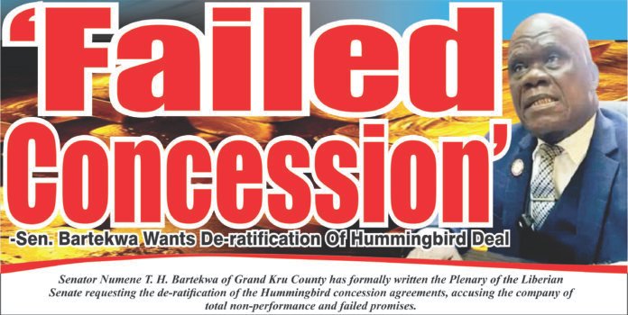 Senator Numene T. H. Bartekwa of Grand Kru County has formally written the Plenary of the Liberian Senate requesting the de-ratification of the Hummingbird concession agreements, accusing the company of total non-performance since the concession was approved.