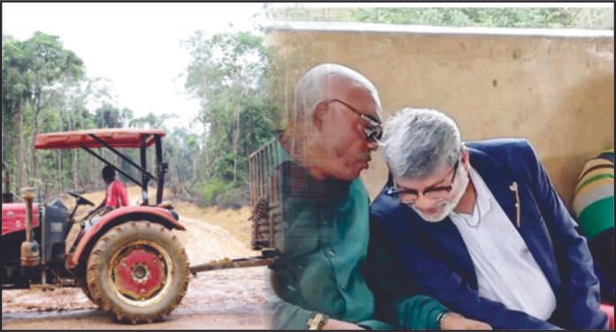 In a video, an African Finch earthmover is seen making a road in the Numopoh Community Forest, while two Asian men supervise. Also, Forestry Development Authority (FDA) records show that the company paid US$500 for timber identification tags.