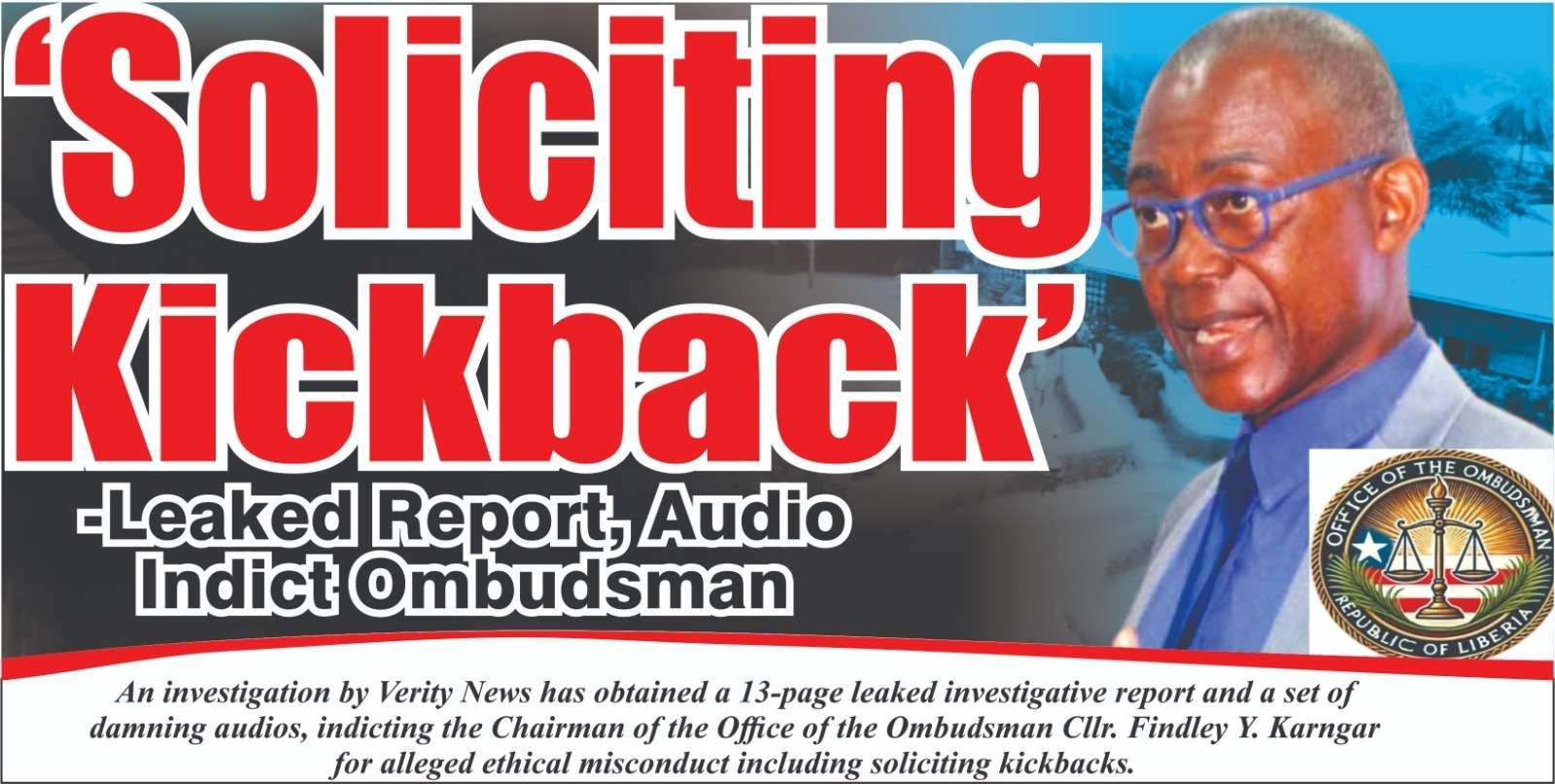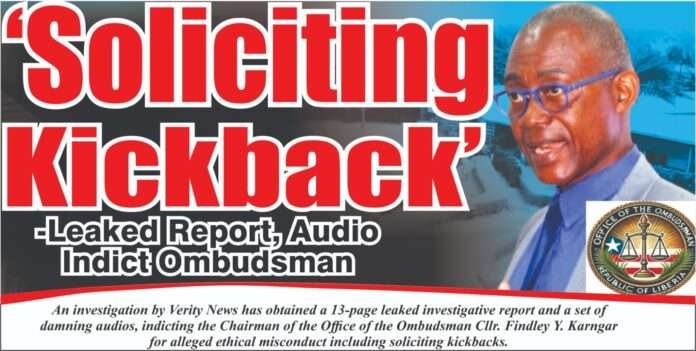 An investigation by Verity News has obtained a 13-page leaked report and a set of damning audios, indicting the Chairman of the Office of the Ombudsman Cllr. Findley Y. Karngar for alleged ethical misconduct including soliciting kickbacks.