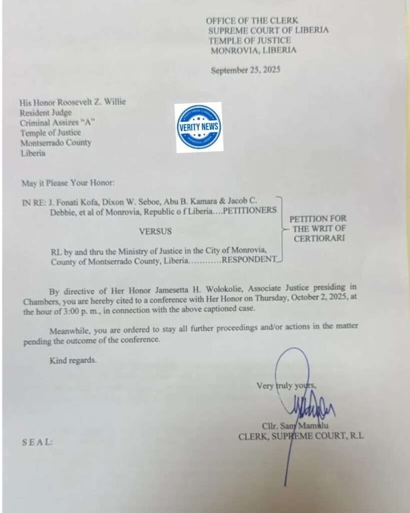 In the directive signed by Clerk Mamulu, the Supreme Court summoned Judge Willie to appear before Her Honor Justice Wolokolie, who is presiding in Chambers, for a conference.
