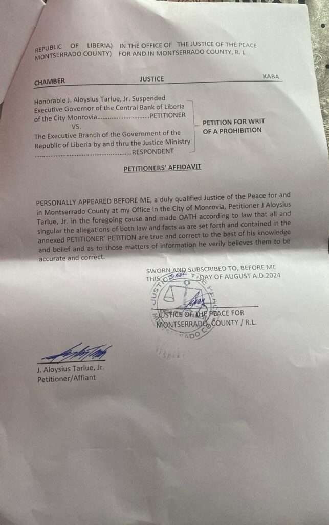 The legal team of the suspended Governor of the Central Bank of Liberia, Mr. J. Aloysius Tarlue, has petitioned the Justice in Chambers of the Supreme Court, His Honor Yussif D. Kaba, to issue a writ of prohibition against his suspension.