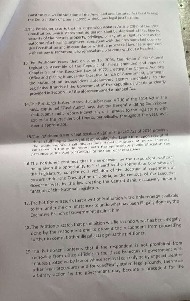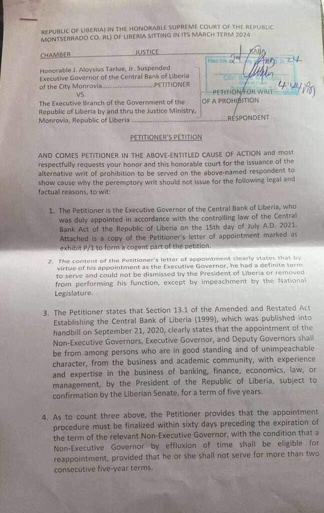 In his petition, Tarlue’s legal team argues that his suspension violates the tenure protection provided under the Central Bank Act, which stipulates that the removal of the Executive Governor can only occur through impeachment.