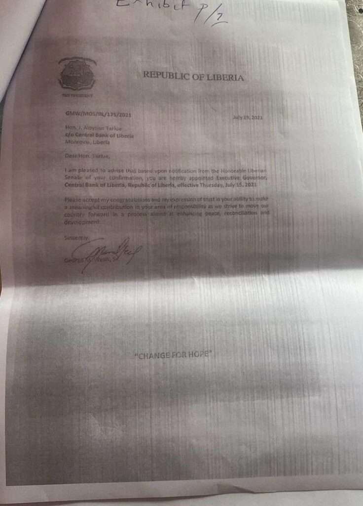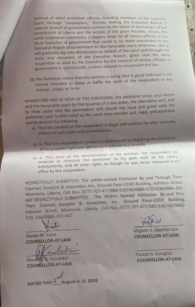 Tarlue’s lawyers, in a petition filed on August 2, 2024, argue that their client has a definite five-year term to serve and cannot be dismissed by the President of Liberia or removed from performing his duties except through impeachment by the National Legislature, as provided for in Section 13.1 of the Amended and Restated Act Establishing the Central Bank of Liberia (1999).