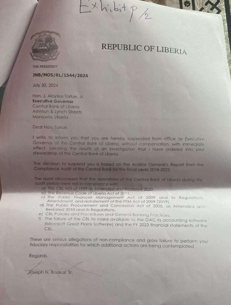 The suspension letter from President Boakai, dated July 30, 2024, references a compliance audit conducted by the General Auditing Commission (GAC), which highlighted serious irregularities in the operations of the Central Bank.