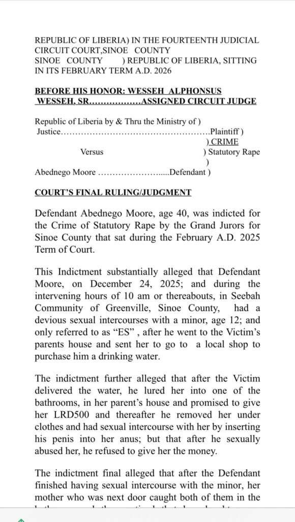 Moore denied the allegation and argued that the accusation stemmed from a dispute over unpaid wages, claiming the girl’s father had refused to pay him LRD3,500 for three days of brush-clearing work.