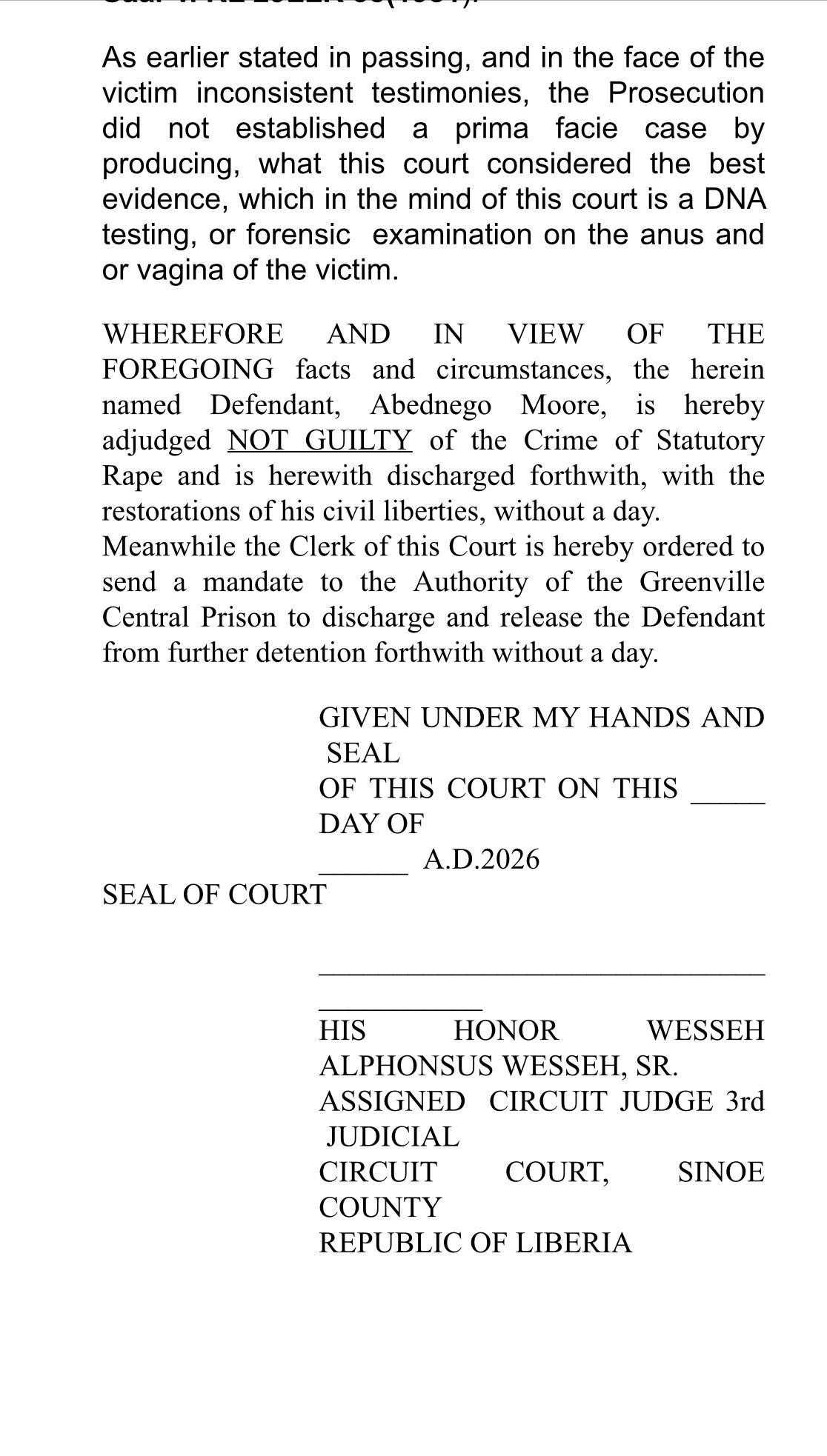 Presiding Circuit Judge Wesseh Alphonsus Wesseh delivered the ruling on Tuesday, March 10, 2026, in Greenville, clearing defendant Abednego Moore of allegations that he raped a 12-year-old girl in Seebay Community.