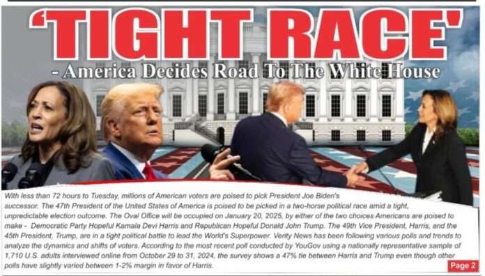 The 49th Vice President, Harris, and the 45th President, Trump, are in a tight political battle to lead the World’s Superpower. Verity News has been following various polls and trends to analyze the dynamics and shifts of voters. According to the most recent poll conducted by YouGov using a nationally representative sample of 1,710 U.S. adults interviewed online from October 29 to 31, 2024, the survey shows a 47% tie between Harris and Trump even though other polls have slightly varied between 1-2% margin in favor of Harris.