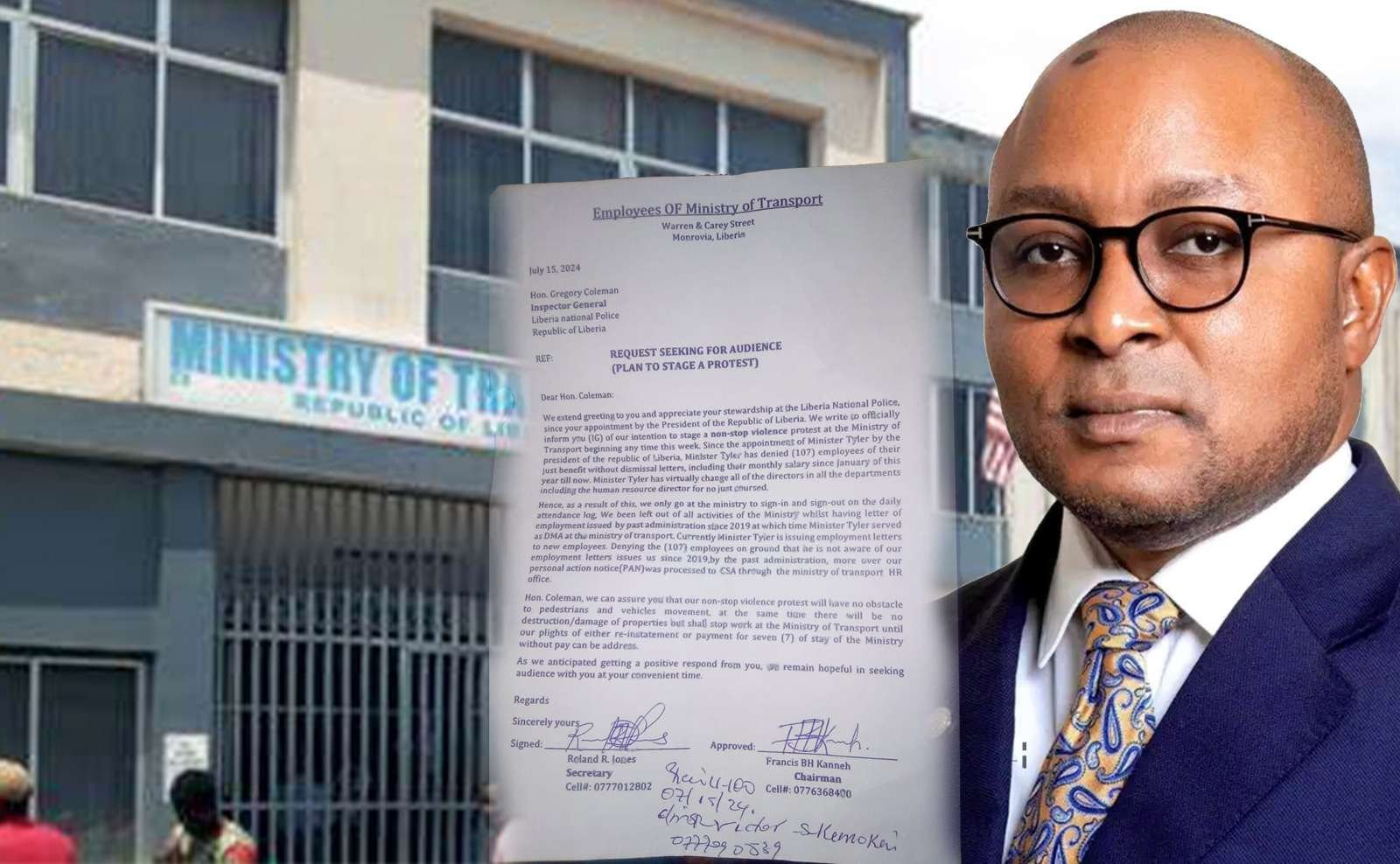 In their letter dated July 15, 2024, which is in our possession, and addressed to Police Inspector General Gregory Coleman, the aggrieved employees detailed their grievances against the Ministry of Transport, particularly under the leadership of Minister Tyler.