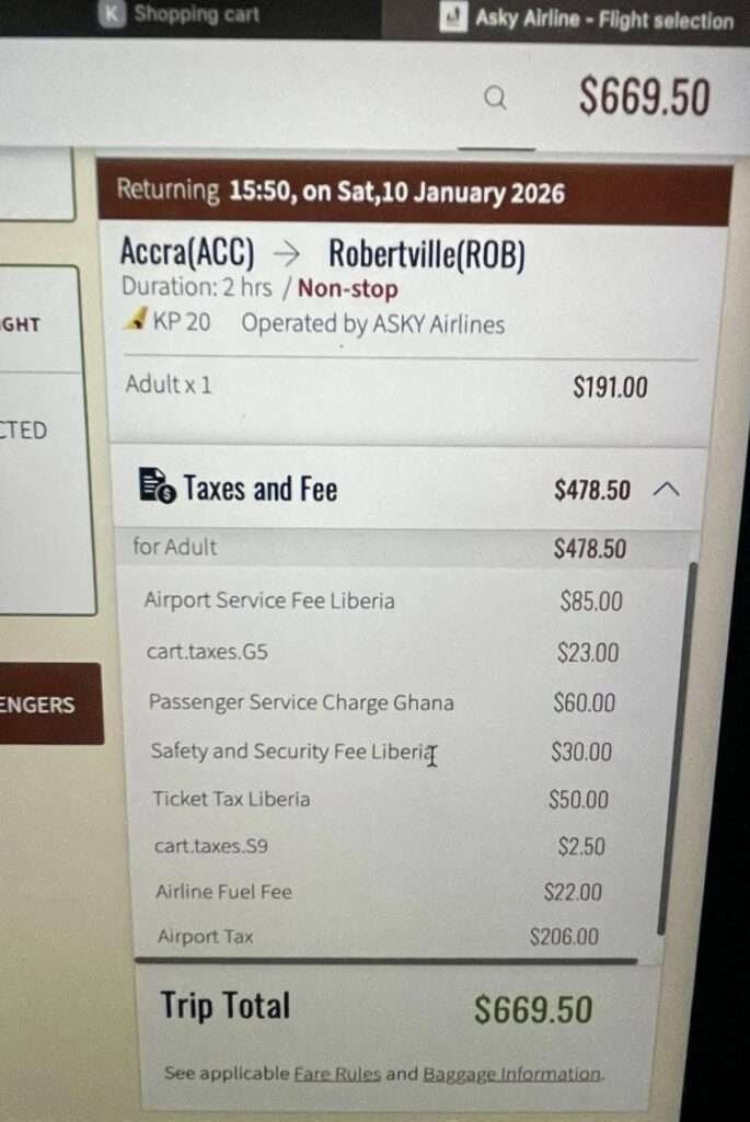 According to the fare summary, the charges included an Airport Service Fee (Liberia) of $85, a Passenger Service Charge (Ghana) of $60, a Safety and Security Fee (Liberia) of $30, a Ticket Tax (Liberia) of $50, and a Fuel Fee of $22, among others. An additional $206 appeared simply as “Airport Tax.”