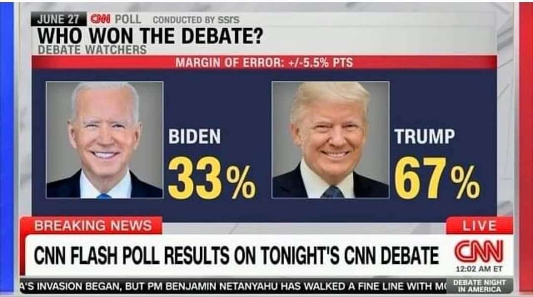 The poll showed Trump soundly defeating Biden, with 67% of debate watchers believing Trump won, compared to 33% who thought Biden performed better.