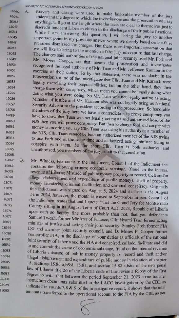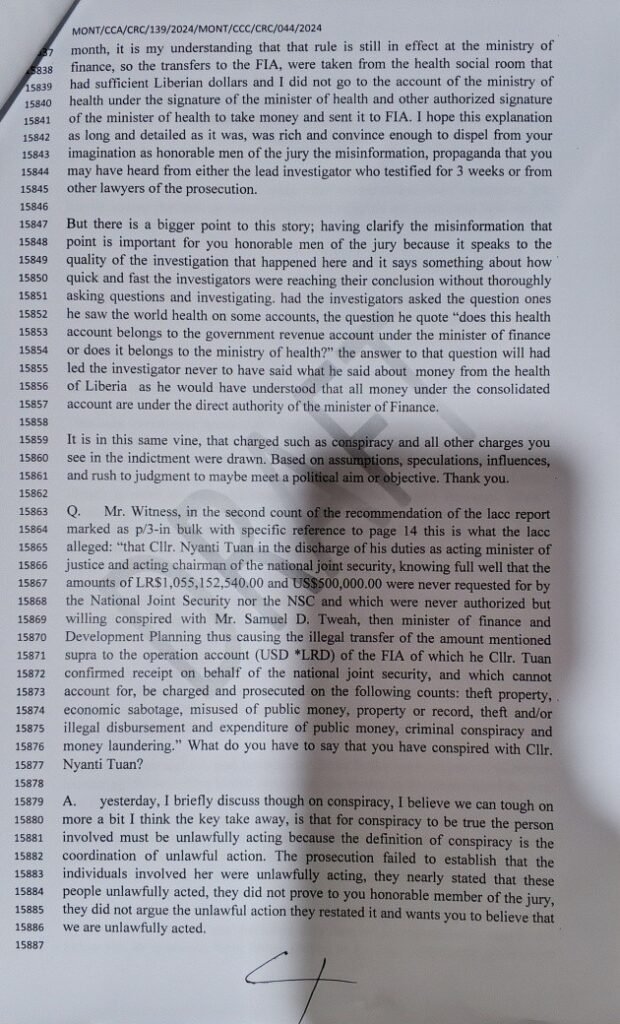 Addressing allegations involving former Acting Justice Minister Nyanti Tuan, Tweah argued that lawful officials performing official duties cannot be accused of conspiracy without proof of illegal intent.