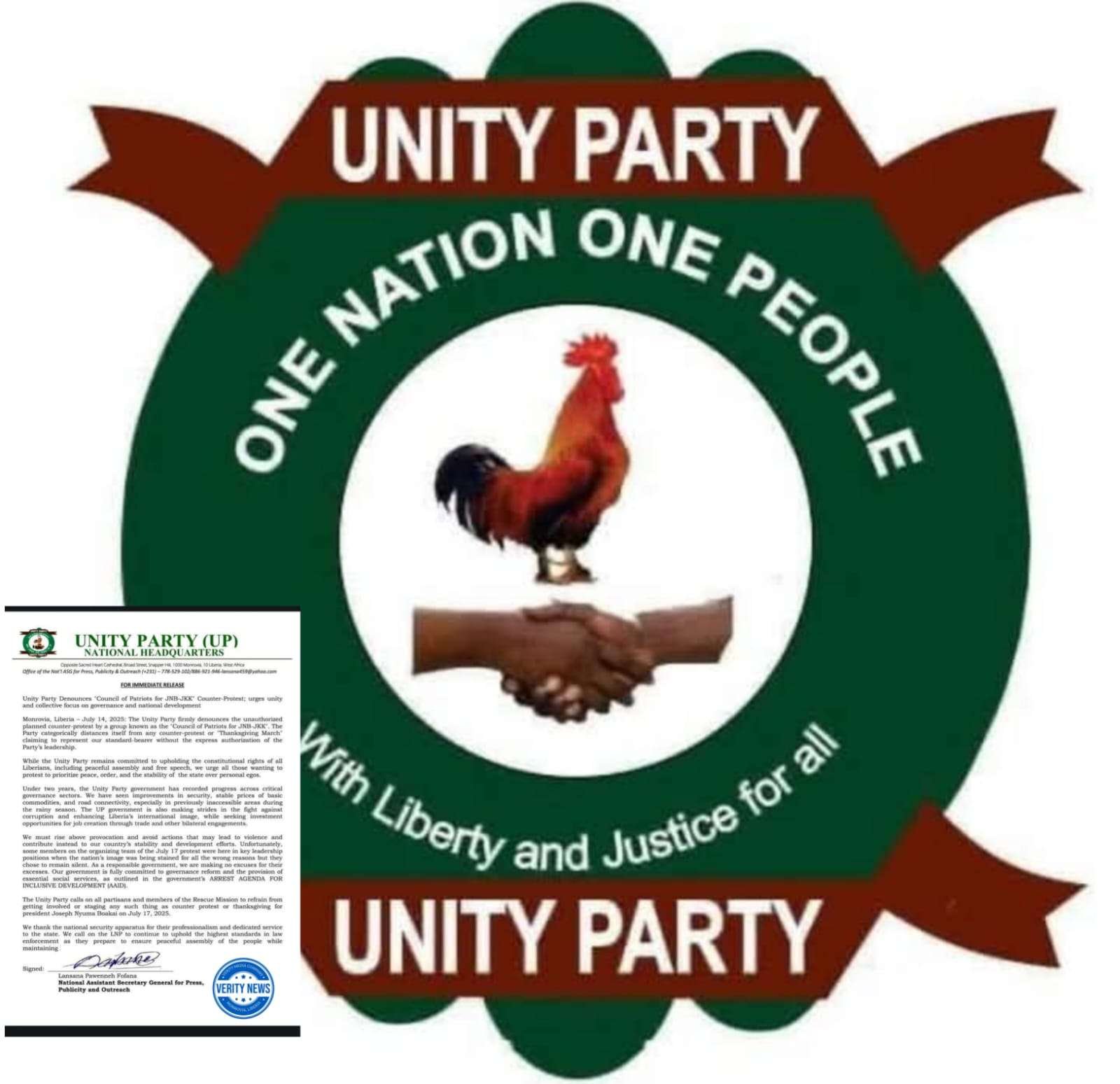 Monrovia, Liberia – The Unity Party has officially denounced the planned counter-protest organized by the group named “Council of Patriots for JNB-JKK,” which they claim represents the Party’s standard-bearer. The Unity Party emphasizes that it has not authorized any such gatherings and reaffirms its commitment to peaceful assembly and free speech.
