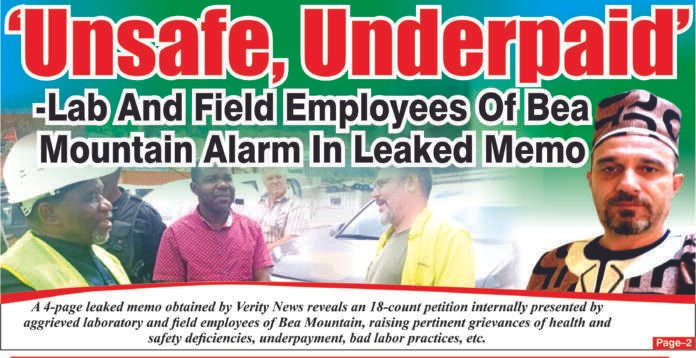 A 4-page leaked memo obtained by Verity News reveals an 18-count petition internally presented by aggrieved laboratory and field employees of Bea Mountain, raising pertinent grievances of health and safety deficiencies, underpayment, bad labor practices, etc.