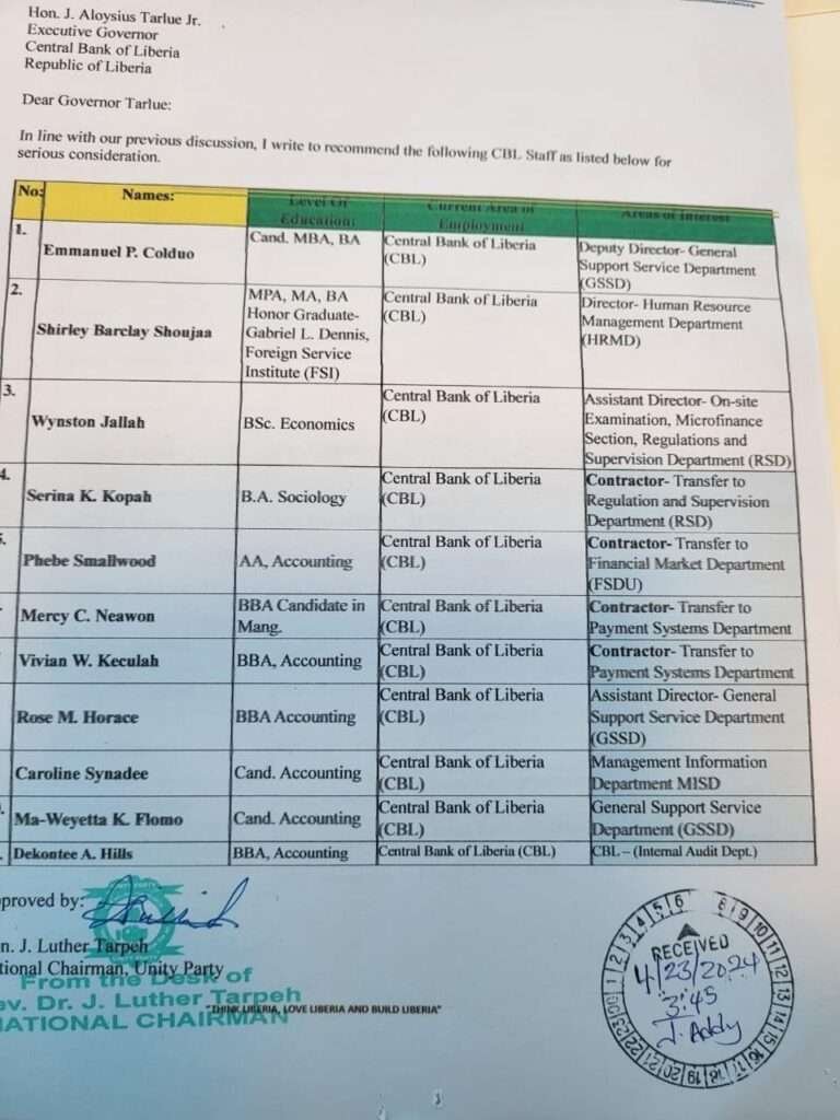 Despite no public announcements of vacancies, Verity News has uncovered a document from the office of Unity Party Chairman, Rev. Dr. Luther Tarpeh, addressed to CBL Governor J. Aloysius Tarlue.