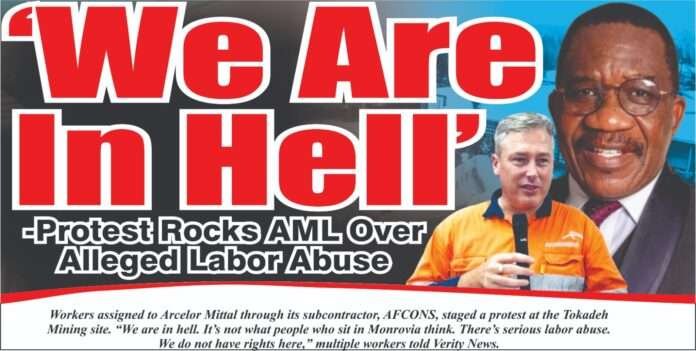 Workers assigned to Arcelor Mittal through its subcontractor, AFCONS, staged a protest at the Tokadeh Mining site. “We are in hell. It’s not what people who sit in Monrovia think. There’s serious labor abuse. We do not have rights here,” multiple workers told Verity News.