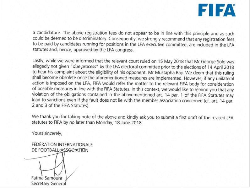 This was the case when Fifa secretary-general Fatma Samoura wrote LFA secretary-general Emmanuel Deah (RIP) on 4 May 2018 to communicate the result of an assessment mission that took place in Monrovia from 24-25 May 2018 in relation to the 14 April 2018 elections, which didn’t produce a president and was marred by a Civil Law Court injunction issued by Judge Peter Gbeneweleh as was prayed for by candidate George Solo.