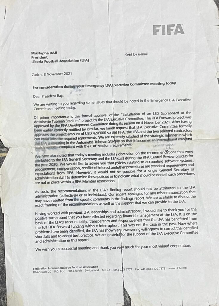 Raji claimed that Solomon Mudege, Fifa head of development programs in Africa, wrote the executive committee on 8 November 2021 about a planned meeting meant to either suspend or expel him after he had blackmailed Vice Presidents Sekou Konneh (Prof.) and Wilmot F. Smith to Fifa but it turned out to be a malicious and black lie.